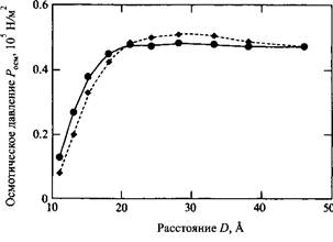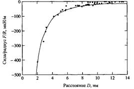 Таким образом, сила, действующая между двумя полярными поверхностями, экспоненциально уменьшается с расстоянием между ними. Это полезное приближение, которое в большинстве случаев пригодно для расчета силы, действующей между плоскими заряженными стенками, погруженными в раствор электролита. Асимптотическое поведение осмотического давления согласно уравнению было подтверждено многочисленными экспериментами. Было доказано не только экспоненциальное уменьшение давления с расстоянием, но и установлено, что наклон зависимостей в пределах экспериментальной ошибки равен толщине ДЭС к-1 . Это можно рассматривать как проверку справедливости теории Дебая-Хюккеля и лежащего в ее основе приближения непрерывной диэлектрической среды. Изменение силы на коротких расстояниях при D < к-1 не очень точно описывается теорией, но несмотря на это можно "подогнать" решение полного нелинейного уравнения Пуассона-Больцмана под экспериментальные кривые, используя наряду с другими параметрами плотность поверхностного заряда как свободный параметр.