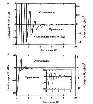 На расстояниях между двумя поверхностями, сравнимых с размерами молекул, на взаимодействие частиц начинают влиять эффекты упаковки. При определенных условиях это приводит к осцилляции профиля плотности и к появлению осциллирующей силы, зависящей от расстояния между поверхностями. Осцилляции могут накладываться на зависимости, отражающие как притяжение, так и отталкивание. Профили плотности для таких модельных систем детально исследованы с помощью компьютерного моделирования. В то же время рассчитать суммарное взаимодействие оказалось намного труднее. Иногда высказывается мнение, что осциллирующий профиль плотности автоматически приводит к осциллирующему профилю силы. Возможно, что это положение справедливо, однако до сих пор оно не доказано. Была осуществлена попытка измерить осцилляторные силы между скрещенными цилиндрами слюды в среде октаметилциклотетрасилана. Оказалось, что период осцилляции вполне соответствует молекулярным размерам. Эти силы слабо зависят от температуры, но небольшие добавки других растворителей или примесей полностью изменяют поведение системы и разрушает картину осцилляции.