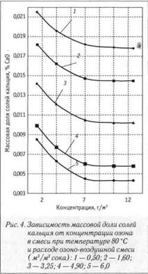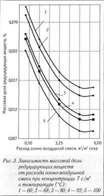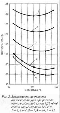 Из представленных графиков видно, что рациональные условия обработки озоном дефекованного сока следующие: температура 85 °С, расход озоно-воз-душной смеси 4,5 м3 /м3 сока, концентрация озона 10 г/м3 .