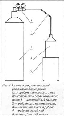 Для насыщения сусла кислородом использовали экспериментальную установку, состоящую из кислородного баллона, редуктора с манометрами, трубки, гермегимески соединяющей баллон с сосудом, ишюлненным пивным суслом (рис. 1).