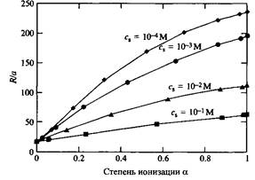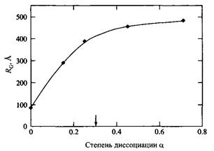 Рис. Зависимость радиуса инерции молекул поли кислоты от степени ионизации.