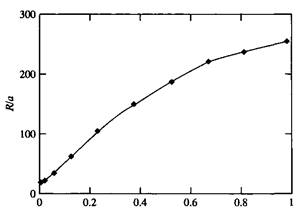 Степень развернутости клубка полиэлектролита увеличивается пропорционально степени ионизации вследствие отталкивания ионизованных групп, но только до определенного предела. Рис.8 иллюстрирует изменение радиуса инерции полиэлектролита в зависимости от степени ионизации. Из рисунка видно, что радиус инерции достигает предельного значения при степени ионизации, равной - 0.3. Для удлиненных молекул полиэлектролитов нет причин для увеличения заряда выше этого значения, поскольку размеры макромолекул не будут далее заметно изменяться, если - 30% способных к ионизации групп переходят в ионизованное состояние. Это соответствует примерно половине величины рК полимера. Далее размеры макромолекул в растворе будут рассмотрены в рамках скейлинговых теорий.