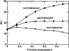 Зависимость усредненного расстояния между концами полимерной цепи Ree от степени ионизации б для растворов полимеров, содержащих противоионы, несущие различные заряды. Ree нормировано на величину а.