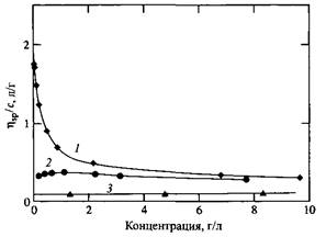 Зависимость приведенной вязкости поливинилпиридина от концентрации полимера в растворах разного состава: 1 - в воде; 2 - в 0.001 MKBr; 3 - в 0.0335 MKBr.