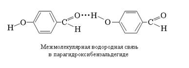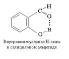 Если Н-связывание наступает в результате взаимодействия кислотного и основного фрагментов внутри одной молекулы, то образующиеся связи называют внутримолекулярными. Соединения с такими связями составляют другую большую группу соединений с водородной связью. Естественно, что образование внутримолекулярных водородных связей возможно, если структура молекулы допускает пространственное сближение фрагментов Х–Н и В до длины водородной связи. Возможность образования внутримолекулярной водородной связи не является препятствием для образования и межмолекулярных водородных связей. В качестве примера рассмотрим изомерные орто- и парагидроксибензальдегиды. Салициловый альдегид (орто-изомер) способен к образованию как внутри-, так и межмолекулярных водородных связей, тогда как для пара-изомера положение взаимодействующих групп допускает образование только межмолекулярных водородных связей