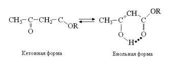 Рассмотрим несколько наиболее характерных примеров влияния водородных связей на свойства органических соединений. Прежде всего это так называемые прототропные процессы – превращения, связанные с переносом протона. Известно, что енольные структуры (гидроксильная группа находится при углероде с кратной связью =С–ОН) являются неустойчивыми и в органической химии часто такие формулы берут в квадратные скобки как указание на их нереальность, гипотетичность. В то же время β-дикетоны и другие 1,3-дикарбонильные соединения способны существовать в двух формах: кетонной и енольной. Для ацетоуксусного эфира эти превращения могут быть представлены схемой