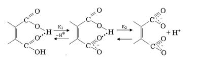 Карбоновые кислоты, как и спирты, могут участвовать в образовании Н-связей как в роли Н-доноров, так и Н-акцепторов. В первом случае кислотность снижается, во втором возрастает. Это ярко проявляется при ионизации двухосновных кислот: первая константа диссоциации (K 1 ) аномально велика, а вторая (K 2 ) аномально мала. Для объяснения наблюдаемых экспериментальных результатов кроме электронных эффектов большая роль придается вкладу Н-связей. В исходной структуре Н-связь сильно активирует карбоксильную группу, выступающую в роли Н-акцептора. В образовавшемся на первой стадии диссоциации моноанионе образуется прочная внутримолекулярная Н-связь, резко снижающая кислотность второго карбоксила: