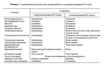 Не имея возможности остановиться на других примерах влияния водородной связи на свойства органических соединений, приведем таблицу сравнительных характеристик проявления меж- и внутримолекулярных Н-связей (табл. 1 (по [1])).