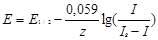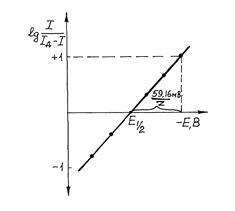 По этому же графику можно определить число электронов z, участвующих в электрохимической реакции. Сделать это можно, найдя котангенс (мВ) и сравнив его с теоретическим значением. Из уравнения полярографической волны следует, что теоретические величины равны соответственно: 59,16 мВ для n = 1; 29,58 мВ для n = 2; 19,7 мВ для