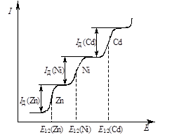 Если в растворе присутствуют несколько деполяризаторов с достаточно большой разностью потенциалов полуволн (не менее 0,2...0,3 В), например, кадмий, никель, цинк, полярографическая волна каждого элемента возникнет последовательно друг за другом и высота волны каждого элемента не зависит от присутствия других элементов (рис. 4). Концентрация определяемого деполяризатора может быть в