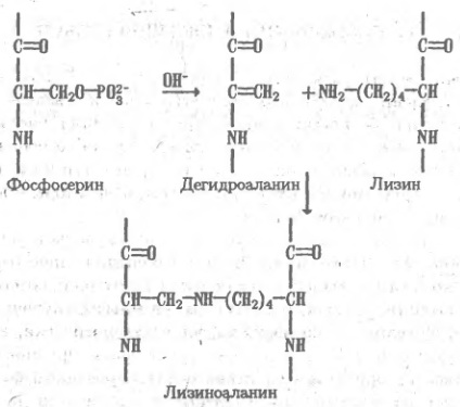 В еще более щелочных растворах происходят реакции, необратимо повреждающие белок, — отщепление серы от остатков цистеина и цистина, β-элиминирование фосфатных остатков в фосфопротеинах, отщепление полисахаридных цепей, присоединенных к остаткам серина в гликопротеинах. Образующиеся в результате этих реакций остатки непредельной аминокислоты — дегидроаланина— присоединяются кблизлежащим ε-аминогруппам лизина с образованием так называемого лизиноаланина— соединения, присутствие которого в кислотном гид-ролизате белка свидетельствует о глубоком повреждении его структуры.