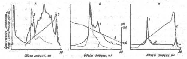 А - разделения неочищенного препарата на аиионите Моно-Q при рН 8 в градиенте концентрации NaCl 0-0.35 М (3):