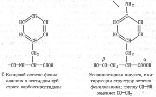 -карбоксильная группа бензилянтарной кислоты взаимодействует с каталитическим центром фермента, а боковая бензильная группа и ошарбоксил — с компонентами зоны связывания субстрата. Образующийся комплекс лиганда, обычно присоединяемого к матрице через аминогруппу, введенную в паpаположение бензольного кольца, связывает фермент весьма прочно.