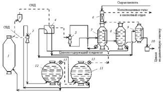 Регенерация SO2 и тепла из продуктов сдувок. Целью регенерации является возвращение в оборот SO2 и тепла, не использованных во время варки целлюлозы. SO2 и тепло регенерируются из сдувочных газов, из сдувочной жидкости, из перепускаемого щелока и из парогазовой смеси, образующейся при вскипании отработанного щелока. Так как сдувочные газы и парогазовая смесь, выделяющаяся при вскипании отработанного щелока, содержат высокий процент SO2 , то при насыщении ими сырой кислоты обеспечивается получение крепкой варочной кислоты.