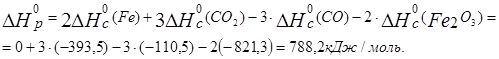 Fe2 O3 ( т ) + 3 CO ( г ) = 2 Fe ( т ) + 3 CO2 ( г ) ,