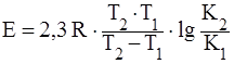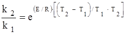 При термической активации для двух температур T1 и T2 отношение констант скоростей будет:
