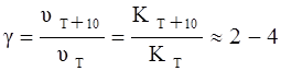 Повышение температуры на 100 увеличивает скорость реакции в 2 – 4 раза (приближенное правило Вант-Гоффа). Число, показывающее, во сколько раз увеличивается скорость реакции (следовательно, и константа скорости) при увеличении температуры на 100 называется температурным коэффициентом реакции:
