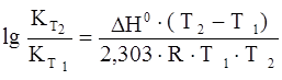 Зависимость константы равновесия от температуры (для температуры Т2 относительно температуры Т1 ) выражается следующим уравнением Вант-Гоффа:
