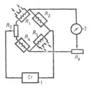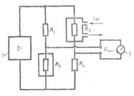 Рис.2. Термохимический газоанализатор: 1 - источник стабилизированного напряжения; 2-вторичный прибор; R1 и R4 - постоянные резисторы; R2 и R3-соотв, сравнительный и рабочий терморезисторы.