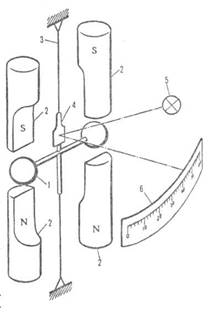 Рис.3. Магнитомеханический газоанализатор: 1-ротор; 2-полюсы магнита; 3-растяжка; 4-зеркальце; 5-осветитель; 6-шкала вторичного прибора.