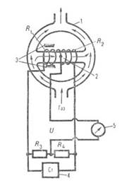 Рис.4. Термомагнитный газоанализатор: 1 - кольцевая камера; 2-стеклянная трубка; 3-постоянный магнит; 4-источник стабилизированного напряжения; 5-вторичный прибор; Rt и R2 - соответственно рабочий и сравнительные терморезисторы (секции платиновой спирали); R3 и R4 - постоянные резисторы.