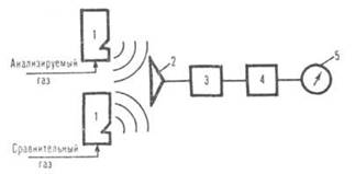 Рис.6. Пневмоакустический газоанализатор: 1 - свисток; 2-смеситель частот; 3 - усилитель - преобразователь; 4 - частотно-аналоговый преобразователь; 5-вторичный прибор.