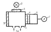 Рис.9. Флуоресцентный газоанализатор: 1 - детекторная камера; 2-источник УФ - излучения; 3-светофильтр возбуждающего излучения; 4 - светофильтр люминесценции; 5-зеркало; 6-фотоумножитель; 7-вторичный прибор.