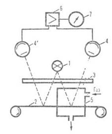 Рис.11. Ленточный фотоколориметрический газоанализатор: 1 - источник излучения; 2-индикаторная лента; 3-светофильтр; 4 и 4'-приемники излучения; 5-газовая камера; 6-усилитель; 7-вторичный прибор.