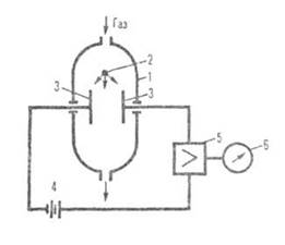 Рис.13. Радиоизотопный ионизационный газоанализатор: 1 - ионизационная камера; 2-источник ионизации; 3-электроды; 4-источник напряжения; 5-усилитель; 6-вторичный прибор.