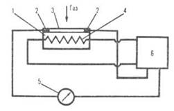 Термохимические газоанализаторы. В этих приборах измеряют тепловой эффект химической реакции, в которой участвует определяемый компонент. В большинстве случаев используется окисление компонента кислородом воздуха; катализаторы - марганцевомедный (гопкалит) или мелкодисперсная Pt, нанесенная на поверхность пористого носителя. Изменение титры при окислении измеряют с помощью металлического или полупроводникового терморезистора. В ряде случаев поверхность платинового терморезистора используют как катализатор. Величина связана с числом молей М окислившегося компонента и тепловым эффектом соотношением:, где kо коэффициент, учитывающий потери тепла, зависящие от конструкции прибора.