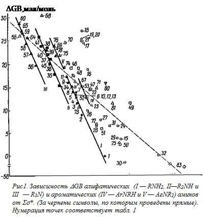 При этом оказалось, что первичные алифатические и третичные ароматические амины случайно ложатся практически на одну и ту же линию (прямые I и V на рис. 1). Величина ρ* (~ — 17, если перевести ее в размерность рКа ) здесь оказалась значительно выше, чем для воды (~-3) и других заместителей.