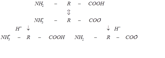 В кислой среде, когда в результате избытка водородных ионов подавлена ионизация карбоксильных групп, молекула белка ведет себя как основание, приобретает положительный заряд и при электрофорезе движется к катоду. В щелочной среде, наоборот, подавлена ионизация аминогрупп, и молекула белка ведет себя как кислота и при электрофорезе передвигается к аноду.