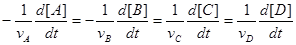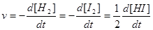 знак минус ставят, когда скорость выражается через убыль концентрации исходного вещества, чтобы скорость была положительной величиной. Скорость выражается через прирост концентрации иода водорода, разделана на стехиометрический коэффициент 2, чтобы все три выражения были численно одинаковы.