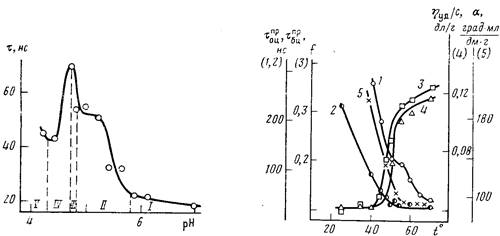 Рис. 5. Зависимость т от рН для сополимера глутаминовой кислоты и лейцина (83 — 17 мол.%) в воде при 25° [10]. Области: I — клубок; II—IV — формирование внутренней структуры: а-спирали (II), компактной структуры (III), глобулы (IV); V — межмакромолекулярные ассоциаты Рис. 6. Температурные зависимости (для ПХМ-10 в гептане) т0 цпр (1), ТбЦ пр (2), вклада / высокочастотных движений (3), т|уд /с (4) и оптической активности [а] (5); г) „р=0,38 сП