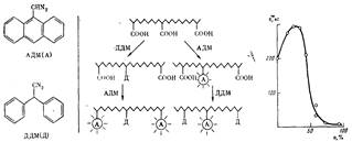 Для изучения реакционной способности функциональных групп одинакового химического строения (карбоксильных), присоединенных к раз-нозвенным макромолекулам, и ее связи с локальными динамическими характеристиками полимерных цепей разработана специальная методика, схема которой представлена на рис. 9. Используются два реагента одного типа, два арилдиазометана. Один из них — 9-антрилдиазометан (АДМ) — содержит люминесцирующую группу, другой — дифенилдиазометан (ДДМ) — «темновой» и способен блокировать наиболее реакционноспособные карбоксильные группы макромолекул без образования люминес-цирующих меток. Варьируются последовательность и глубина реакций с участием сначала одного, затем другого реагента. Модифицированные таким образом полимеры исследуются методом поляризованной люминесценции. Применение этой методики к изучению как синтетических гетерополимеров (сополимеры ММА и метилакрилата с «меточным», т. е. менее 0,1 мол. % содержанием звеньев метакриловой кислоты [26]), так и природных полимеров (на примере белка химотрипсиногена [27]) позволило обнаружить, что макромолекулы исследованных полимеров характеризуются химической гетерогенностью (различной реакционной способностью функциональных групп одинакового химического строения). При этом