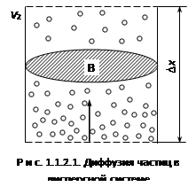 – объем дисперсной системы). Диффузия направлена из области с большей концентрации в область с меньшей концентрацией, т.е. снизу вверх (на рис. показано стрелкой). Диффузия характеризуется определенной скоростью перемещения вещества через поперечное сечение В