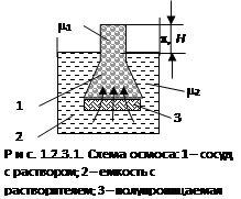 На схеме (рис. 1.2.3.1) в сосуд с полупроницаемой перегородкой 3, помещен раствор 1. Перегородка пропускает дисперсионную среду (растворитель), но является препятствием для коллоидных частиц (растворенных веществ). Снаружи перегородки – чистый растворитель 2. Концентрация раствора по обе стороны перегородки различна. Внутри сосуда 1 часть раствора занимают молекулы растворенного вещества (частицы дисперсной фазы) Þ концентрация растворителя там меньше, чем в емкости 2 с чистым растворителем.