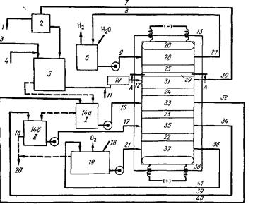 Рис. 3. Схема процесса выделения серной кислоты из травильного растворас помощью электролиза: / — твердый оксид железа; 2—5, 9 — 13, 15—17, 21 — 38 (в тексте); 6 — 1 н. NaOH; 7 — рецикл травильного раствора; 8 — рецикл католита; 14а, 146 — концентрирующие камеры I и II; 18 — подача свежей воды или концентратора II; 19 — 5—6 н. HjSO, или полисульфонат; 20 — выделенная серная кислота, возвращаемая на стадию травления; 39 — рецикл из концентрирующей камеры II; 40 — рецикл из концентрирующей камеры I; 41 — рецикл анолита