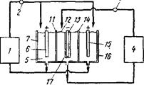 Процесс можно проводить в электролизерах различной конструкции. При этом может быть использован любой кислотостойкий материал, например пластмассы или стекловолокно. Электролизер наиболее, простой конструкции состоит из анодной и катодной камер, разделенных катионселективной мембраной. Другая конструкция показана на рис. 5. Электролизер 7 состоит из центральной катодной камеры 17 с катодом 13 и двух боковых анодных камер 5 и 16 с анодами 6 и 15. Катодная камера отделена от анодных камер катионселективными мембранами 11 и 14. В резервуаре для католита 4 находится отработанный травильный раствор, который циркулирует через катодную камеру с помощью насоса 3. В резервуаре для анолита 1 находится раствор сульфата аммония, который циркулирует через анодные камеры с помощью насоса 2. На катоде осаждается железо 12.