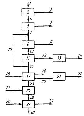 Неорганический материал 23 из регенерационной печи подают в резервуар 24, где при обработке водой 25 получается зеленый раствор 26. Последний в аппарате 27 обрабатывают негашеной известью 28, в результате чего карбонат натрия превращается в гидроксид натрия. Раствор 30, выводимый из аппарата 27, возвращается для использования в качестве варочного раствора. Карбонат кальция, образующийся в процессе подщелачивания, направляют в печь для обжига извести и последующего повторного использования.