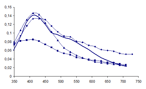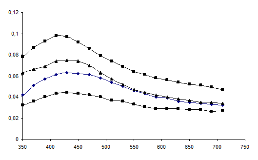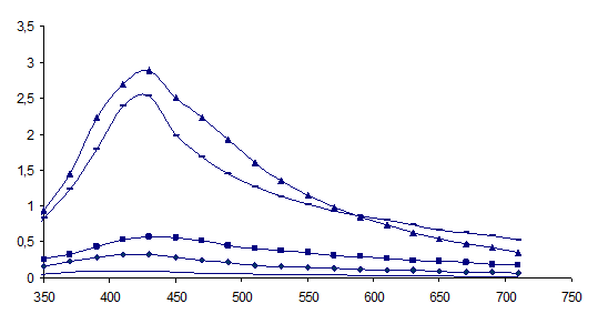 Рисунок 8 - Спектры оптического поглощения гидрозоля серебра, полученного восстановлением AgNO3 глюкозой (■ – С = 0,001М, ♦ - С = 0,005М, ▲ – С = 0,01М, + – С = 0,05М).