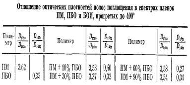 При термообработке пленок, в состав которых входят ПАК ПМ и ПОА в различных соотношениях, в спектрах происходят изменения, аналогичные изменениям в спектрах исходных компонентов: в области 100—250° идет имидизация ПАК, при температурах до 450° замыкаются бензоксазольные циклы ПВО (рис. 2, в). В таблице приведены максимальные относительные интенсивности полос 1780 и 1670 см-1 в ПМ, ПВО и БОИ. Как видно, в сополибензоксазолимидах отношение оптических плотностей полос Dnao/Dmoи DieiJDmoблизки к их величинам в ПМ и ПВО. Можно полагать, что завершенность реакции циклообразования в этих полимерах практически одинакова.