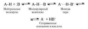 По современной терминологии, образование водородной связи наступает при взаимодействии протонодонора (кислоты Бренстеда, электроноакцептора) с протоноакцептором (основанием, электронодонором). Водородную связь можно представить как невалентное взаимодействие между группой А – Н одной молекулы и атомом В другой, в результате которого образуется устойчивый комплекс А – Н….В с межмолекулярной водородной связью, в котором атом водорода играет роль мостика, соединяющего фрагменты А и В. Но нужно заметить , что до настоящего времени нет однозначного подхода , какую конкретно связь называть водородной. Большинство авторов к понятию водородной связи относят дополнительное взаимодействие, которое возникает между атомом водорода и электронодонором В, то есть связь Н….В. Другие авторы к понятию водородной связи относят всю цепочку Х – Н….В, то есть связь между атомами Х и В через водородный мостик. Образование водородной связи может быть представлено как кислотно – основное взаимодействие, определяющее первую стадию переноса протона при протолитических реакциях