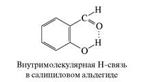 Если Н-связывание наступает в результате взаимодействия кислотного и основного фрагментов внутри одной молекулы, то образующиеся связи называют внутримолекулярными. Соединения с такими связями другую большую группу соединений с водородной связью. Образование внутримолекулярных водородных связей возможно, если структура молекулы допускает пространственное сближение фрагментов Х-Н и В до длины водородной связи. Возможность образования внутримолекулярной водородной связи не является препятствием для образования и межмолекулярных водородных связей.