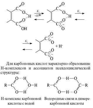 Карбоновые кислоты, как и спирты, могут участвовать в образовании Н-связей как в роли Н-доноров, так и Н-акцепторов. В первом случае кислотность снижается, во втором возрастает. Это ярко проявляется при ионизации двухосновных кислот: первая константа диссоциации (K 1 ) аномально велика, а вторая (K2 ) аномально мала. Для объяснения наблюдаемых экспериментальных результатов кроме электронных эффектов большая роль придается вкладу Н-связей. В исходной структуре Н-связь сильно активирует карбоксильную группу, выступающую в роли Н-акцептора. В образовавшемся на первой стадии диссоциации моноанионе образуется прочная внутримолекулярная Н-связь, резко снижающая кислотность второго карбоксила.