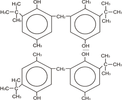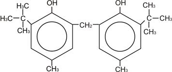 Молекула БФ может находиться в цис-,транс-форме и в форме димера. В этой молекуле образование водородной связи осуществляется за счет возможности перехода одной конформации в другую, то есть за счет вращения относительно оси – СН2 – Цис-форма БФ образует внутримолекулярные водородные связи (как показано на рисунке). Если молекула цис-БФ перейдет в транс-форму, то ОН-группы окажутся по разные стороны относительно оси – СН2 – и становиться возможным образование межмолекулярной водородной связи, то есть образования димера БФ. В молекуле БФ, также как и в молекуле ионола в орто-положениях находятся трет-бутильные заместители, которые также затрудняют взаимодействие ОН-групп, но благодаря тому, что БФ может находиться в транс-форме, возможно образование межмолекулярной водородной связи.
