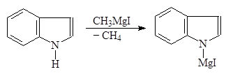 Индол является слабым основанием. Кислые свойства индола несколько выше, чем у пиррола. В индоле неподеленная пара электронов атома азота сильнее чем в пирроле втягивается в сопряжение, взаимодействуя не только с p-электронами пиррольного кольца, но и испытывая влияние бензольного кольца. Как слабая кислота индол с натрием в жидком аммиаке образует N-натрийиндол, с КОН при 130 оС N-калийиндол. Индол реагирует с магнийорганическими соединениями.