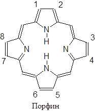 Порфин - темно-красное кристаллическое вещество, разлагающееся при 360оС. Порфины, частично или полностью замещенные по положениям 1-8, называют порфиринами.