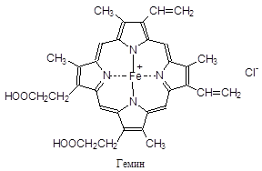 Гемоглобин осуществляет в организме транспорт кислорода от легких к тканям. В гемоглобине железо находится в двухвалентном состоянии. Соответствующее соединение железа, свободное от белкового компонента, т.е. комплекс железа (II) с порфирином, называют гемом.