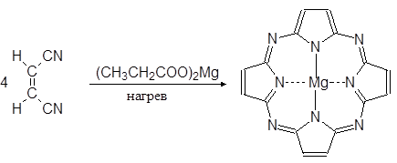 Окрашенный в пурпурный цвет его комплекс с магнием образуется при нагревании динитрила малеиновой кислоты с пропилатом магния: